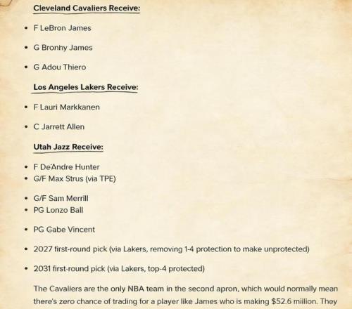 爵士得到:亨特、斯特鲁斯、梅里尔、鲍尔、2027年首轮签、2031年首轮签(均来自湖人)
